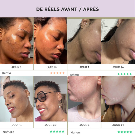 J’avait des tâches et boutons a ne point finir depuis j’ai découvert les produits de séfia ma vie a changé. Je sort sans maquillage j’arrive à m’assumer je le recommande fortement depuis 22 août jusqu'à maintenant que j’utilise merci beaucoup a séfia pour le beau temps que vous faites. 🥰🥰🥰